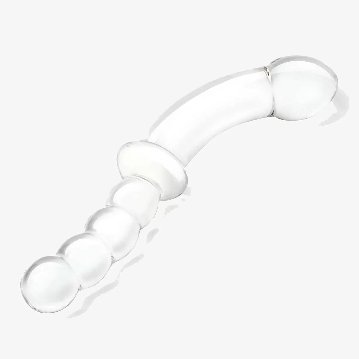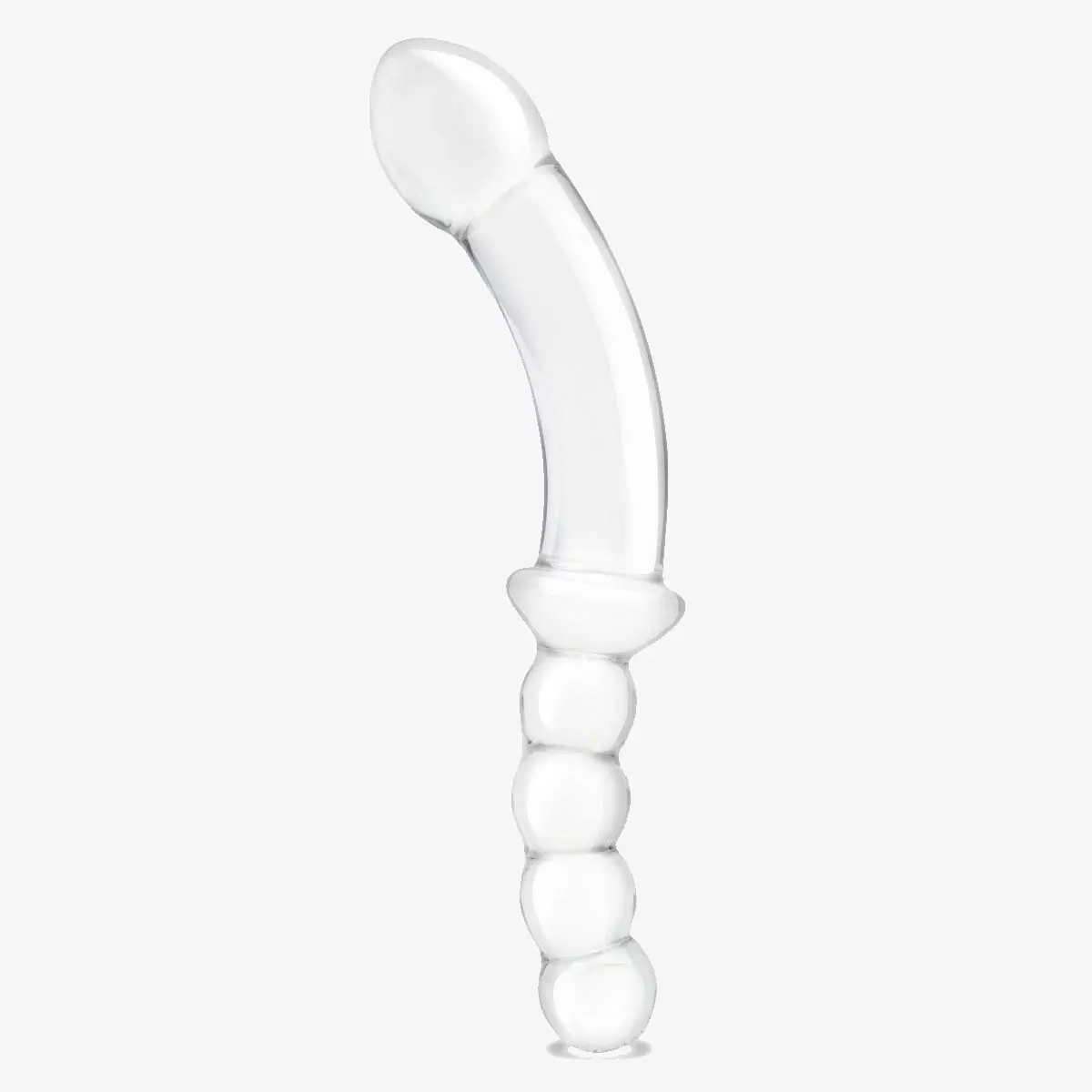 Go deep with the Glas 12.5 Curved Glass Dildo featuring one smooth curved end with a teardrop tip and another beaded end for anal stimulation. Each delightful tip offers its own distinct form of satisfaction. Use the smooth teardrop-shaped end to target the G-Spot or P-Spot.The anal beads on the other end are perfect for beginners to explore backdoor play. The flared mid-base offers secure enjoyment and for further hygienic safety glass is hypoallergenic glass and easy to clean. Elevate your sensory journey with temperature play – heat or cool the dildo for thrilling new experiences. Compatibility with all lubricants allows you to tailor your encounters to perfection. Measurements (approx.)Length: 12.5inchInsertable Length: 6.25inch & 4.5inch