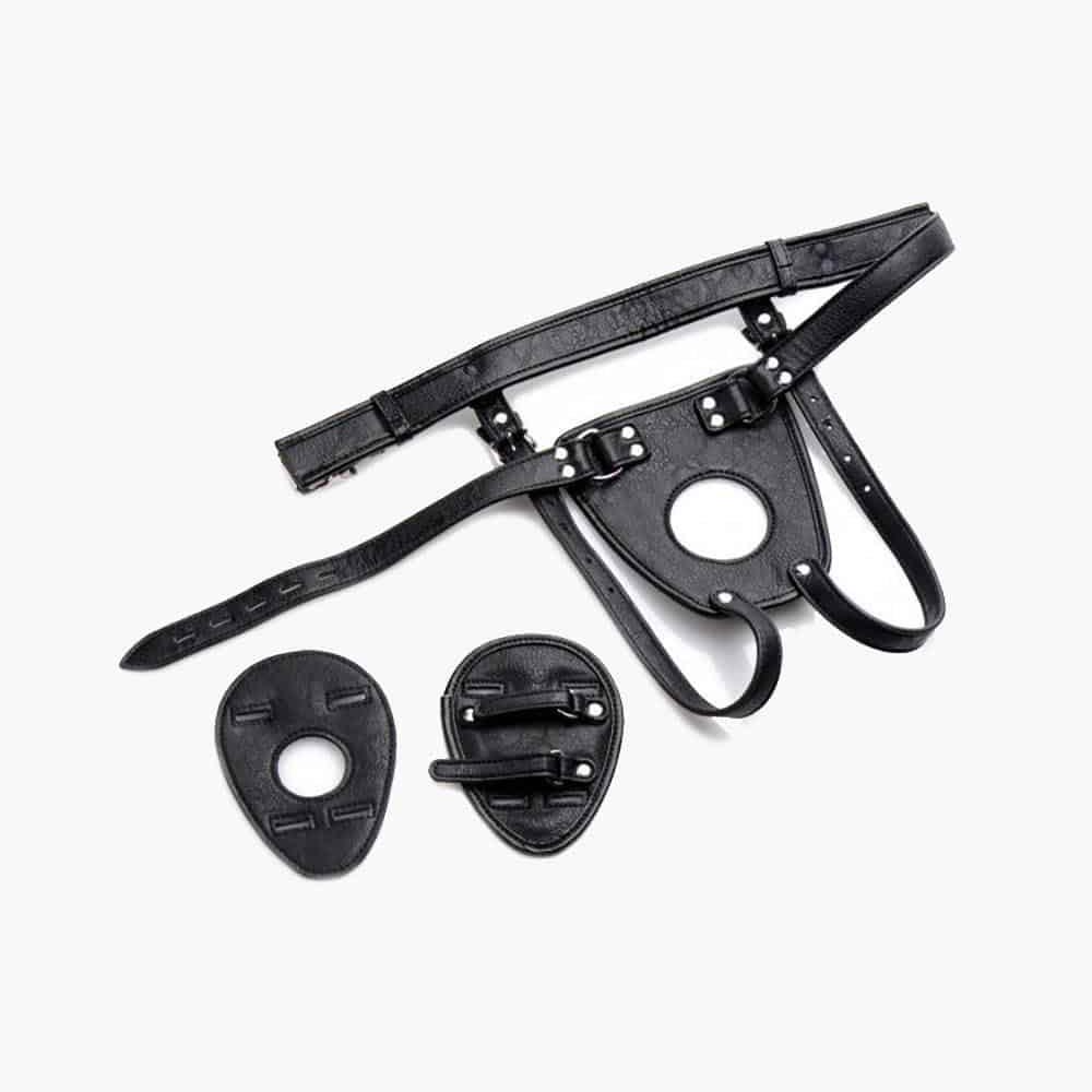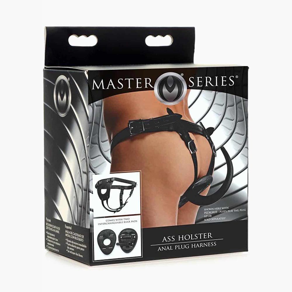 This attractive leather-like harness adjusts around the waist and buttocks for a customized fit tightening against their asshole to keep your favorite plug or dildo pushed deep into them. Two rear pads are included to accommodate a standard butt plug with velcro straps that will lock in the base or a tail plug with a hole that allows the accessory to flow out for exposure. The cock and ball opening keeps their package in convenient reach for you to play with. Locking buckles will keep your slave helplessly trapped!