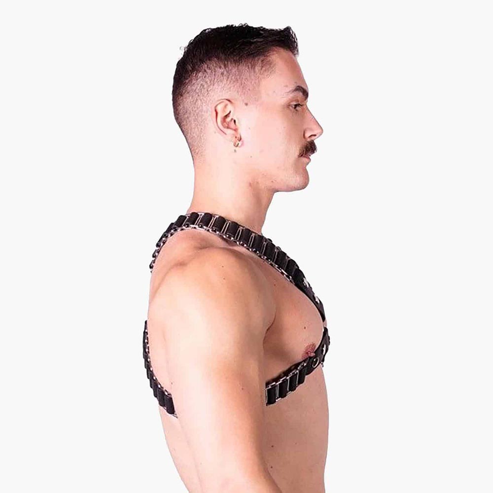 The Prowler RED Ballistic Harness is a striking piece which screams fetish role play and dungeon games. The X design with central ring and metal-work details create an eye-catching and practical harness. Featuring adjustable metal buckle straps and made from quality leather. Perfect to wear at your favourite fetish night.