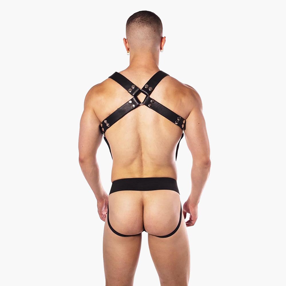 This kinky accessory is finished with press stud detail and the straps are adjustable. It shows off your body and combines a kinky style with comfort. The high quality leather of this harness for men ensures that it shapes to your body with every wear. It comes in sizes Small, Medium Large and X-Large.