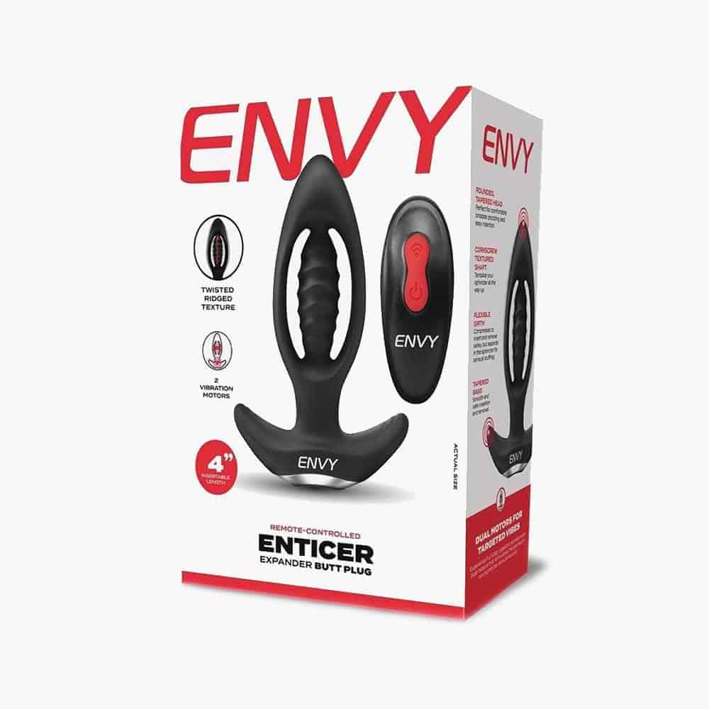 Entice your erogenous zones with the Envy Enticer Expander butt plug. Get full sphincter stimulation from the sensual bump texture enjoy a pleasurable full-feeling combined with the great buzzy vibes. The Enticer plug features a unique flexible girl that is easy to insert yet completely filling to hit all your favourite spots. Made from a high-quality and body-safe silicone the design is seamless and splash-spoof making the Enticer perfect for shower play and easy cleaning. Recharge this plug using the magnetic USB charger ready for your next play session. Come with a remote control to adjust the vibe to suit you Plug is 4 inches insertable length and features 2 vibrating motors with 9 vibration modes for targeting stimulation in the most important areas.