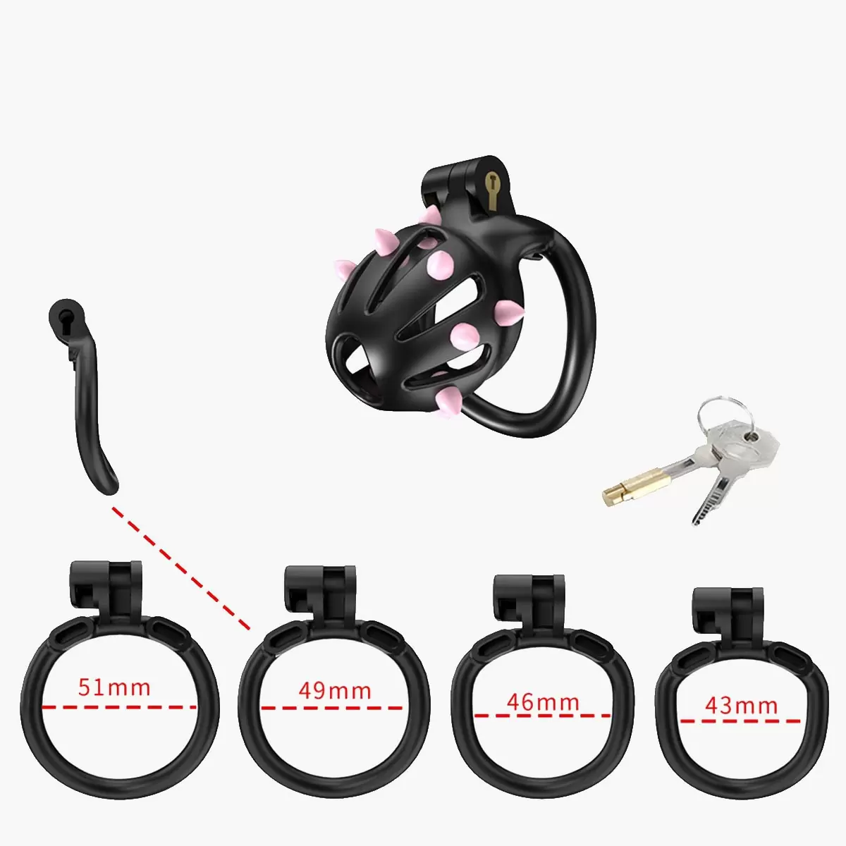 Your CELLMATE FlexiSpike comes with four extra sets of silicone spikes in black and pink for extra customization. By inserting them into the cage you not only can customize the look but it also offers extra stimulation if so desired. Your Cellmate FlexiSpike Cage comes with both a traditional brass lock with 2 keys and with a special ABS plastic adapter pin which allows you to close the cage in Stealth Mode with one of the five plastic locks each bearing an unique tamper proof identifier code which is ideal for travel or metal detector situations.
