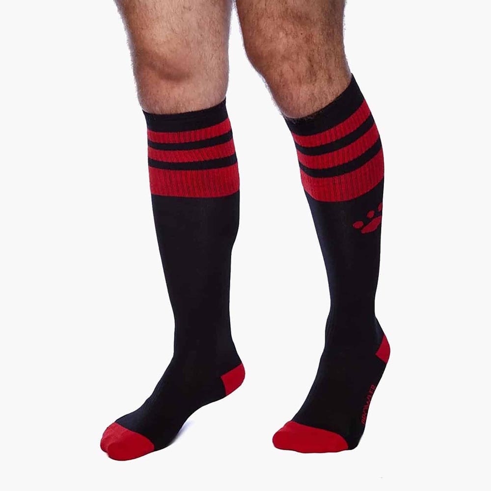 Made from soft material these black socks can ride up to the knee and feature three red coloured stripes at the top as well as the Prowler Paw logo just below them. You can choose from a variety of colours for a sporty masculine look.