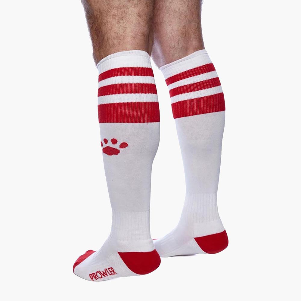 Made from soft material these white socks can ride up to the knee and feature three red coloured stripes at the top as well as the Prowler Paw logo just below them for a sporty masculine look.