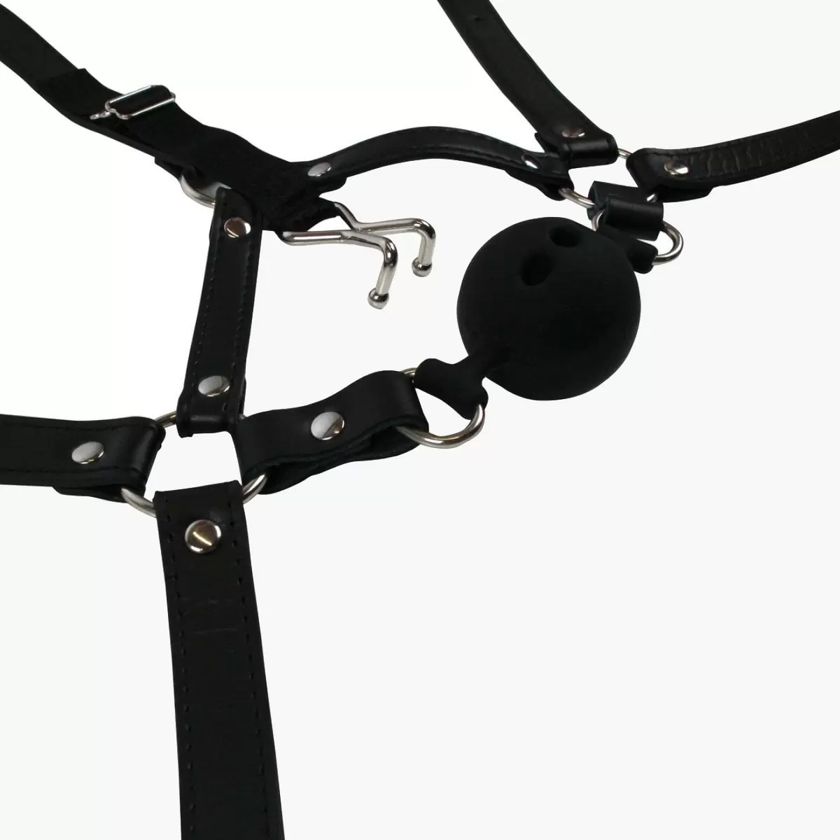 This design brings multiple points of control together in one piece. The gag restricts speech while the harness maintains structure and position, creating a clear, directed dynamic.