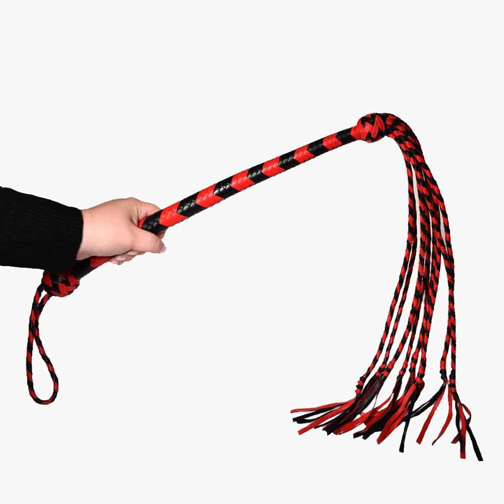 This meticulously crafted flogger features a long handle for precise control and a striking design that blends bold red and intense black hues.