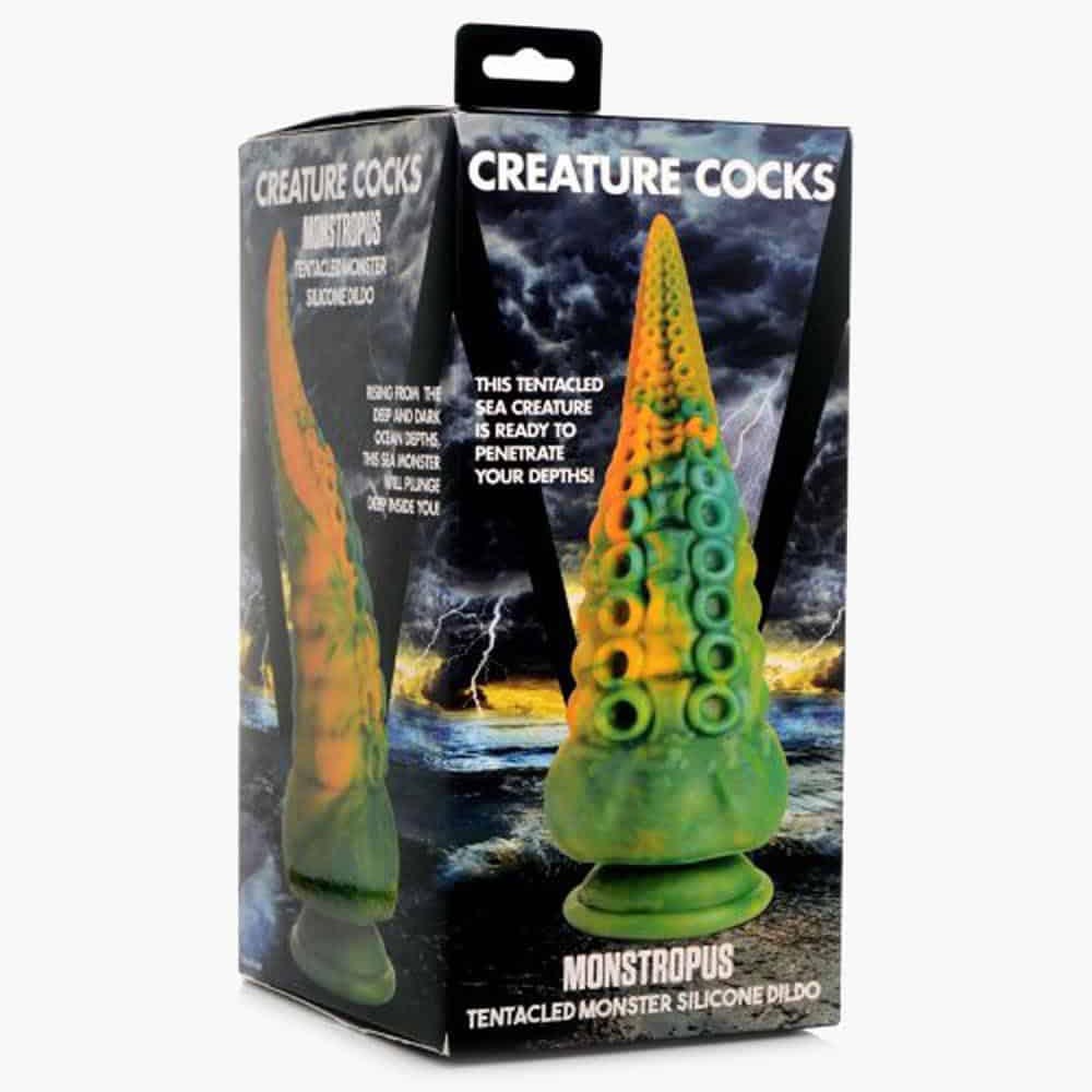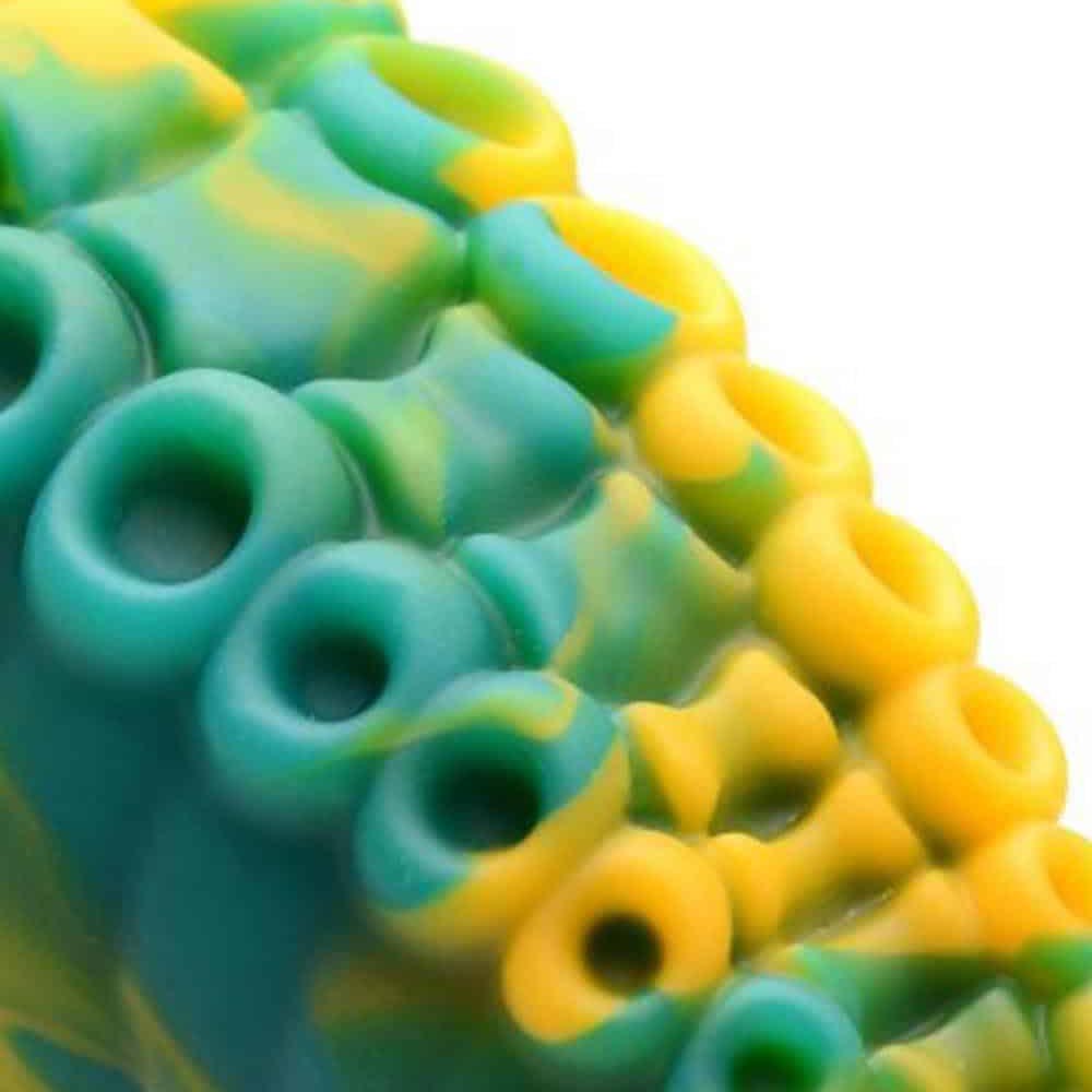 This Creature Cocks Tentacle Dildo will have your fantasies running wild! This long tapered dildo has a marble green yellow and blue color that is unique to each dildo. Enjoy every inch of this unique premium silicone dildo with dual rows of octopus suckers. Use solo and hands-free by pressing the suction cup base against any flat surface or pair with a strap-on harness for partner play!