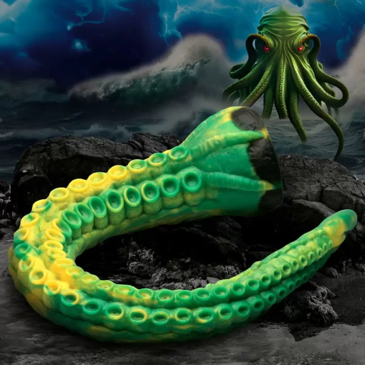 Get deeper than eer before with this extra long silicone tentacle dildo! This green and yellow tentacle is covered with textured suckers. It has a small smooth tapered tip that makes insertion easy. Then it gradually gets bigger and bigger! This tentacle is over 22 inches long has a wide flanged base with a suction cup on it and is made out of flexible premium quality silicone that is phthalate-free and body-safe.You can stick it to any flat surface for hands-free play and enjoy the long deep exporation of your derriere! This is perfect for thos who want kinky fantasy sci-fi play! After use wash it with warm water and mild soap then spray with a toy cleaner. Feel free to soak it in warm soapy water to get a deeper clean as well. Use only with water-based lubricants for best results.