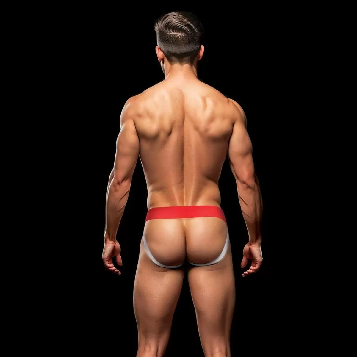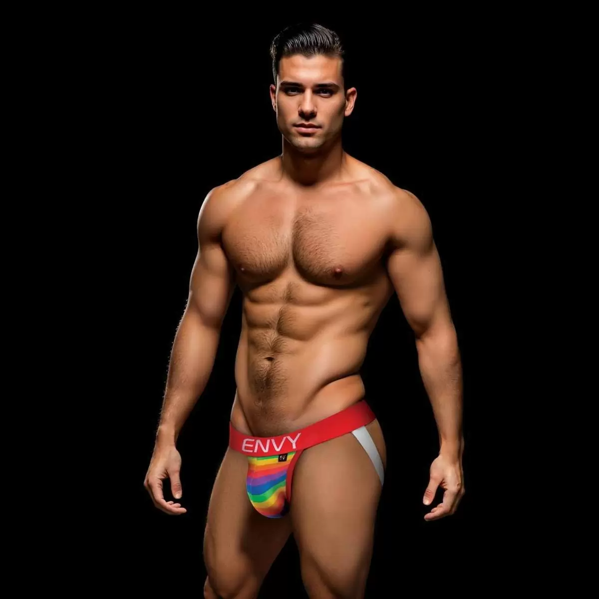 Introducing Envy’s Rainbow Pride Jock Strap merging comfort with bold expression. Crafted from a blend of premium cotton and spandex this jock strap features an open-back design for enhanced breathability and freedom of movement. The vibrant rainbow pattern on the front pouch symbolizes diversity and pride while the striking red waistband proudly boasts the ENVY logo ensuring a secure fit and adding a touch of sophistication. Whether for athletic activities or making a statement embrace individuality and elevate your underwear collection with Envy’s Rainbow Pride Jock Strap