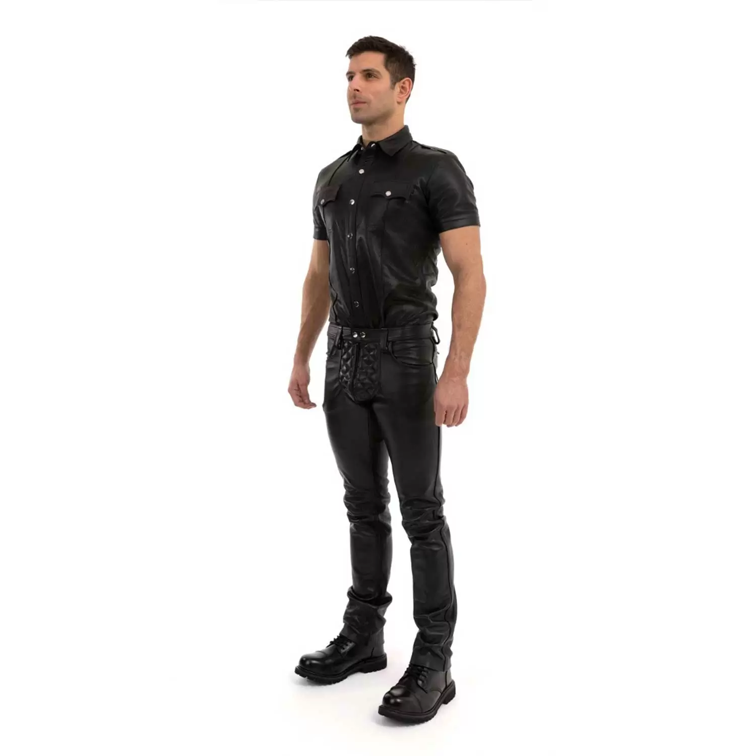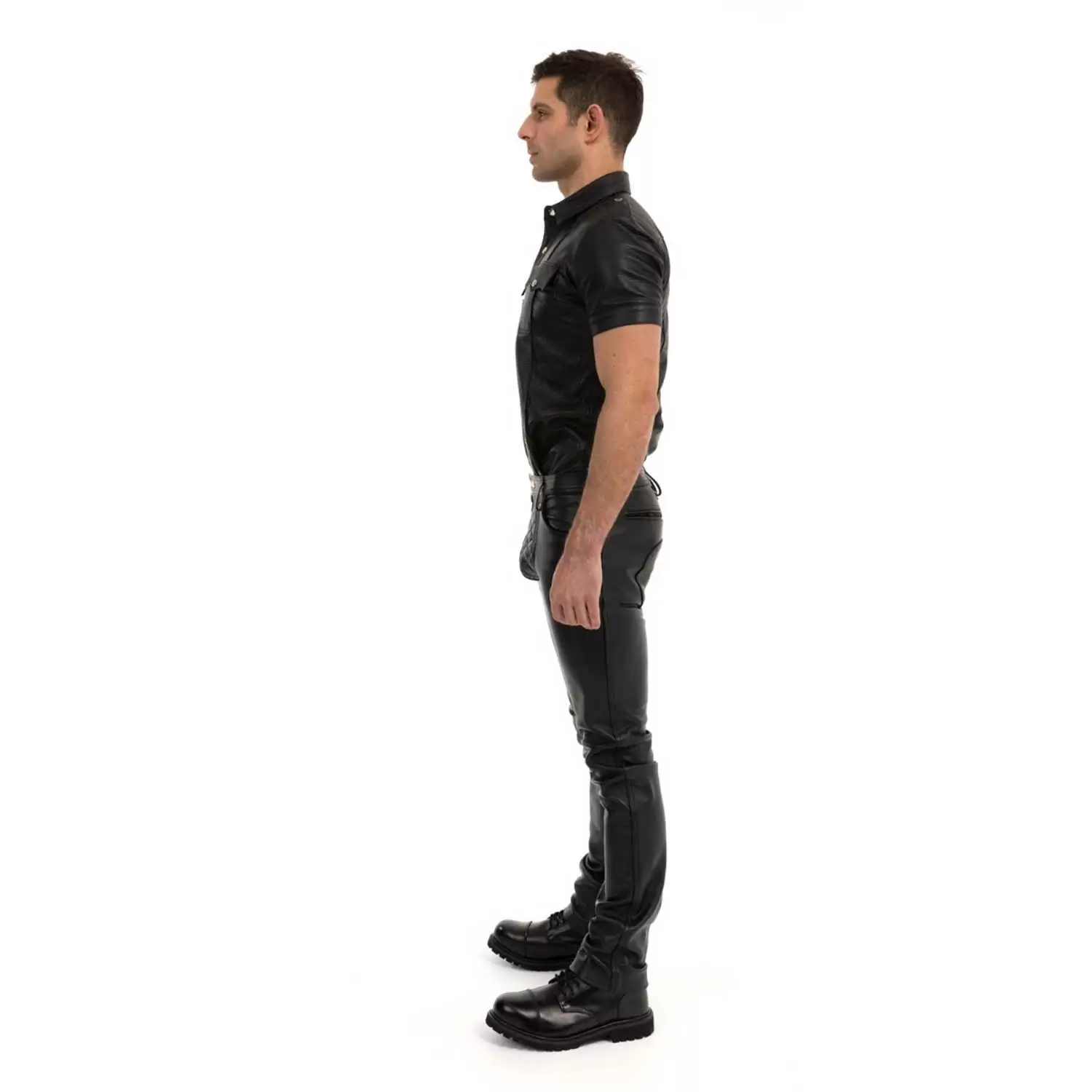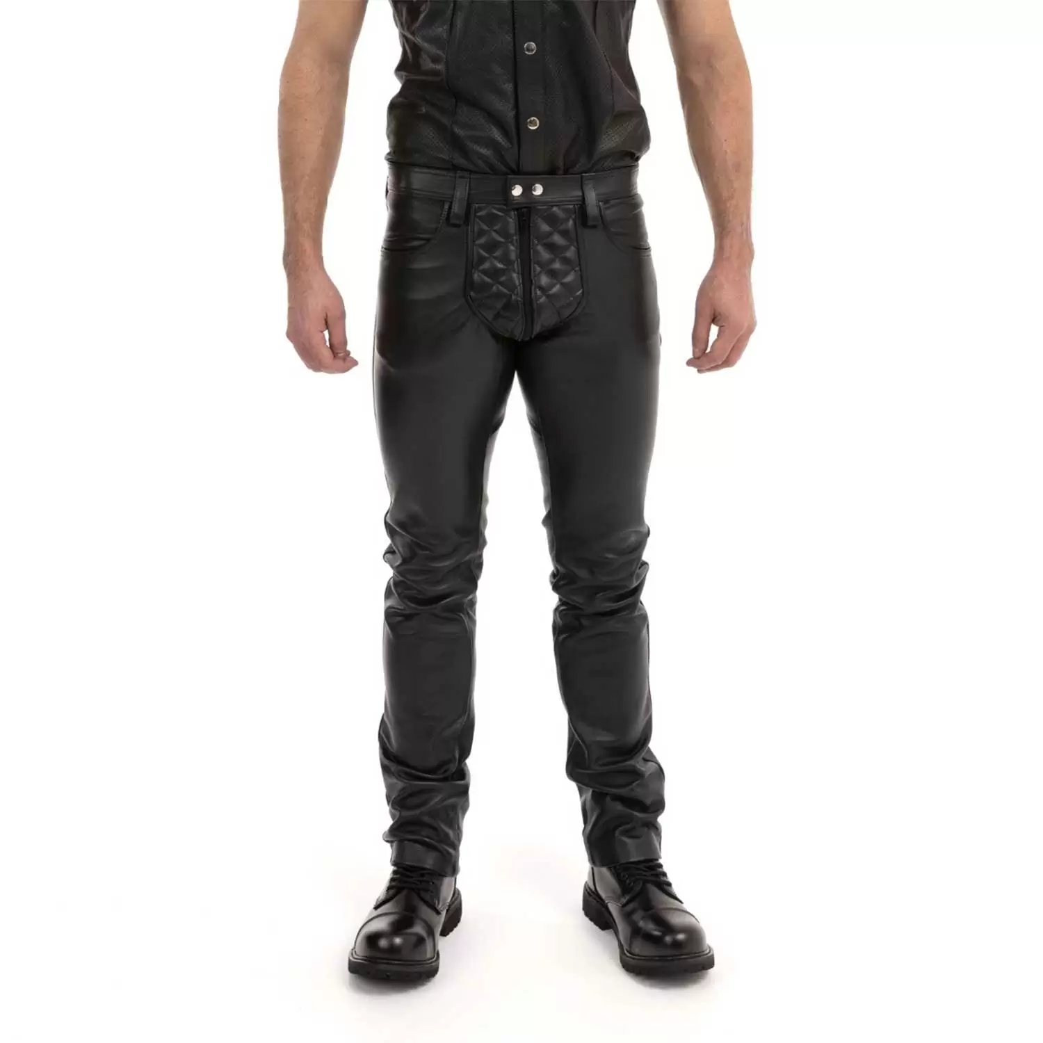 Embrace the low-waisted allure of these black leather rider jeans, creating the perfect canvas for the quintessential biker or BLUF look. The padded crotch adds an extra layer of comfort, ensuring you stay at ease whether you’re hitting the open road or navigating the urban jungle. With slightly tapered legs, these jeans offer a slim fit that effortlessly complements your physique, embodying the essence of rugged yet refined style.