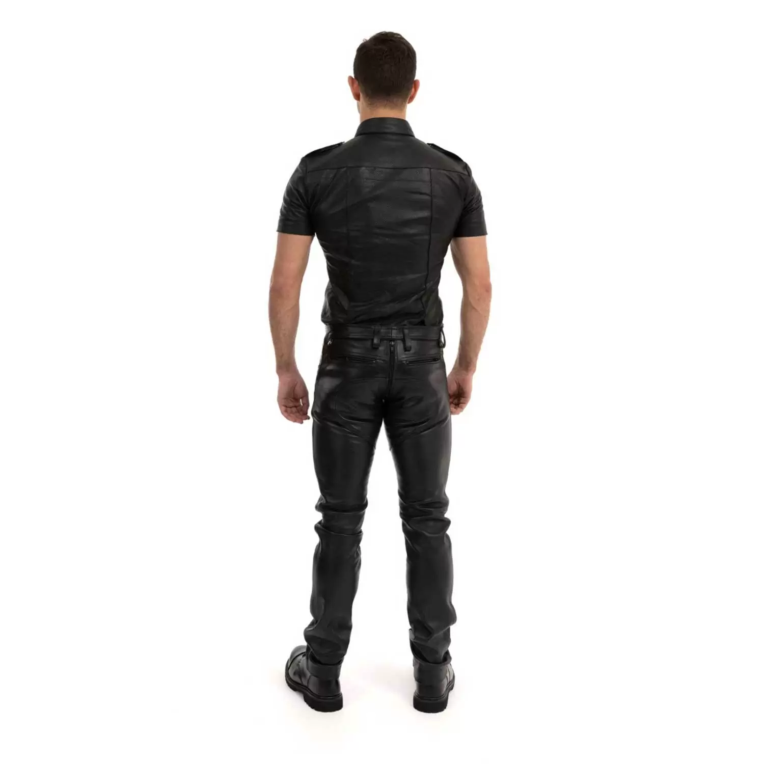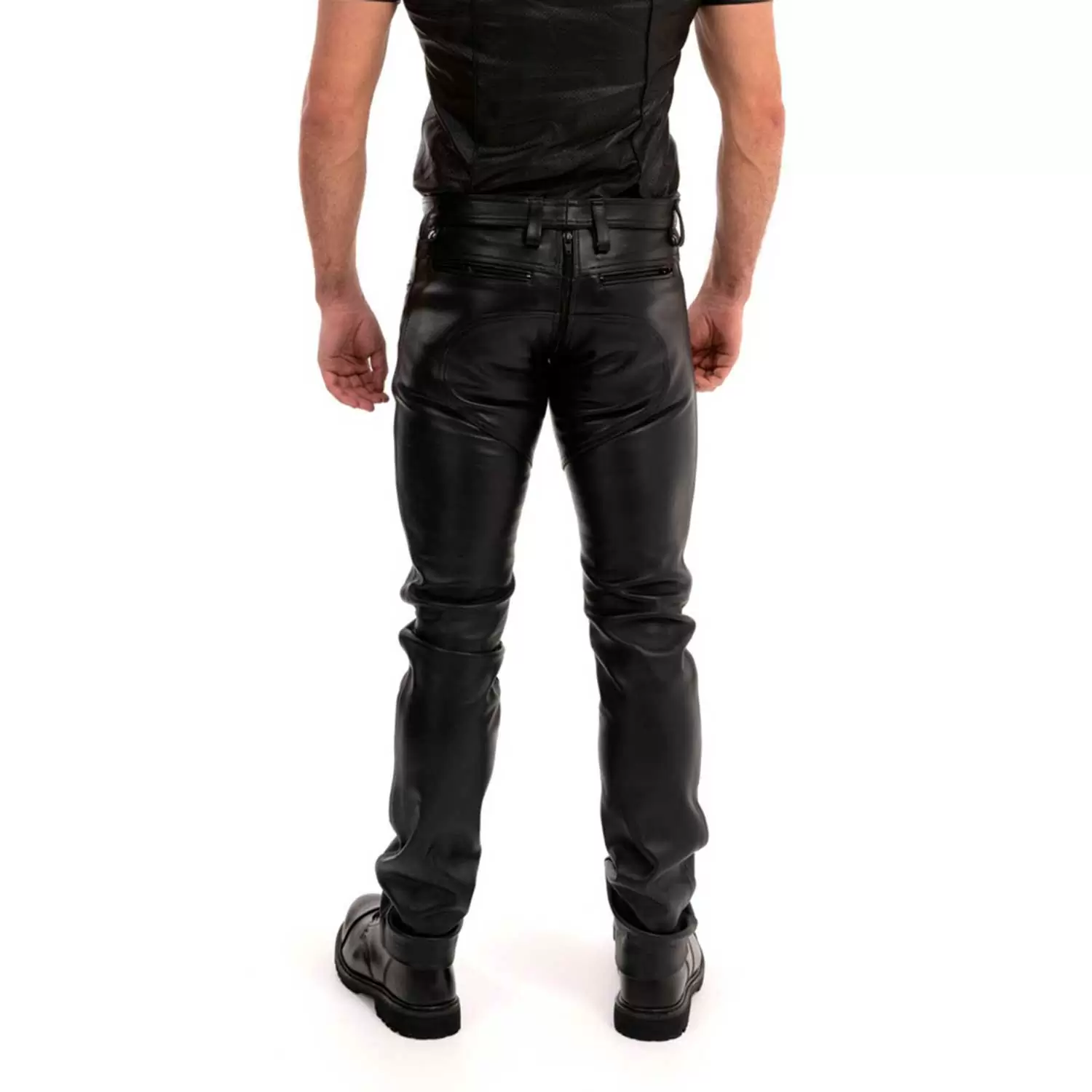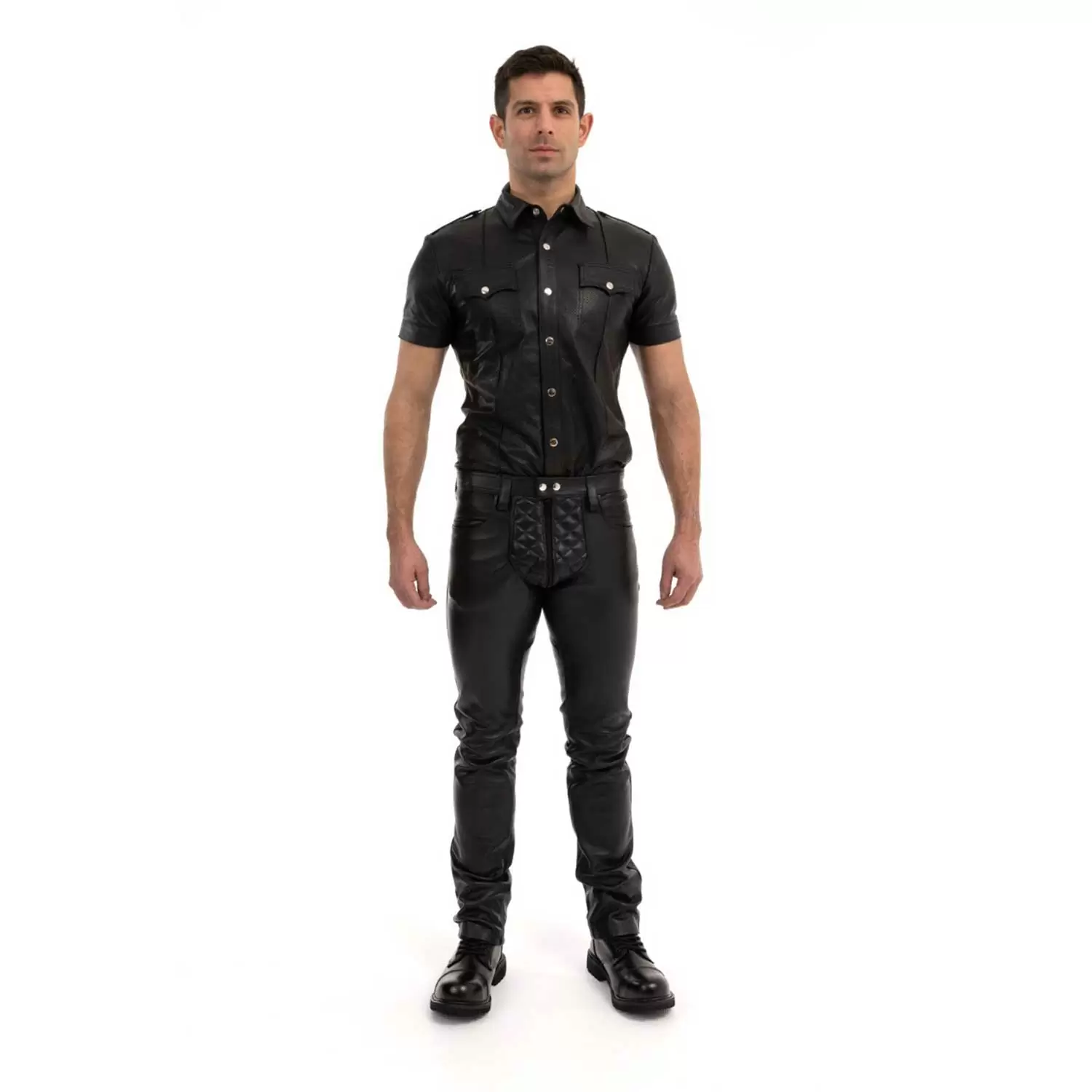 Embrace the low-waisted allure of these black leather rider jeans, creating the perfect canvas for the quintessential biker or BLUF look. The padded crotch adds an extra layer of comfort, ensuring you stay at ease whether you’re hitting the open road or navigating the urban jungle. With slightly tapered legs, these jeans offer a slim fit that effortlessly complements your physique, embodying the essence of rugged yet refined style.
