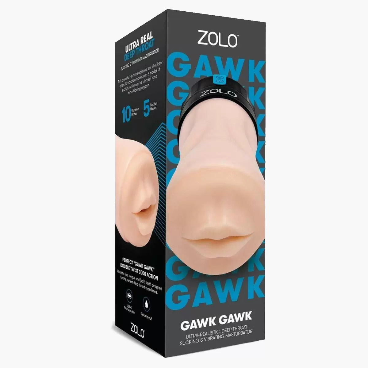 The ZOLO Gawk Gawk is an ultra-realistic deep throat sucking and vibrating masturbator. This powerful rechargeable oral sex simulator offers 10 vibration modes and 5 modes of suction which can be blended for a mind-blowing orgasm. Featuring a fully detailed mouth complete with lips tongue and teeth the Gawk Gawk offers the ultimate deep throat experience. The Gawk Gawk is also USB-C rechargeable waterproof and shower-friendly.