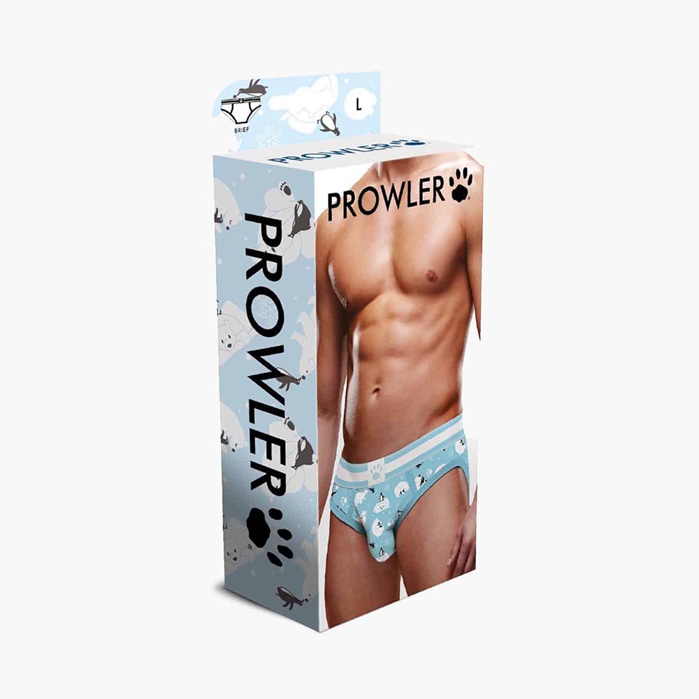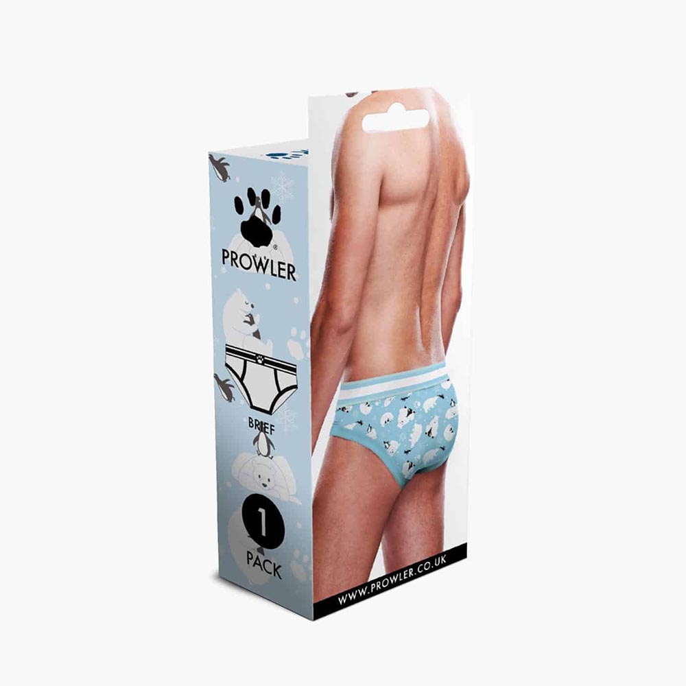 The Prowler Winter Animals Brief Blue White is a great new addition to the Prowler underwear collection. These briefs have a wintery feel with polar bears and penguins. The front has an adorable design reminiscent of chilly winter scapes. The rear fits well against your skin for a flattering fit. These briefs are comfortable and cute, perfect for any winter-themed outfit!